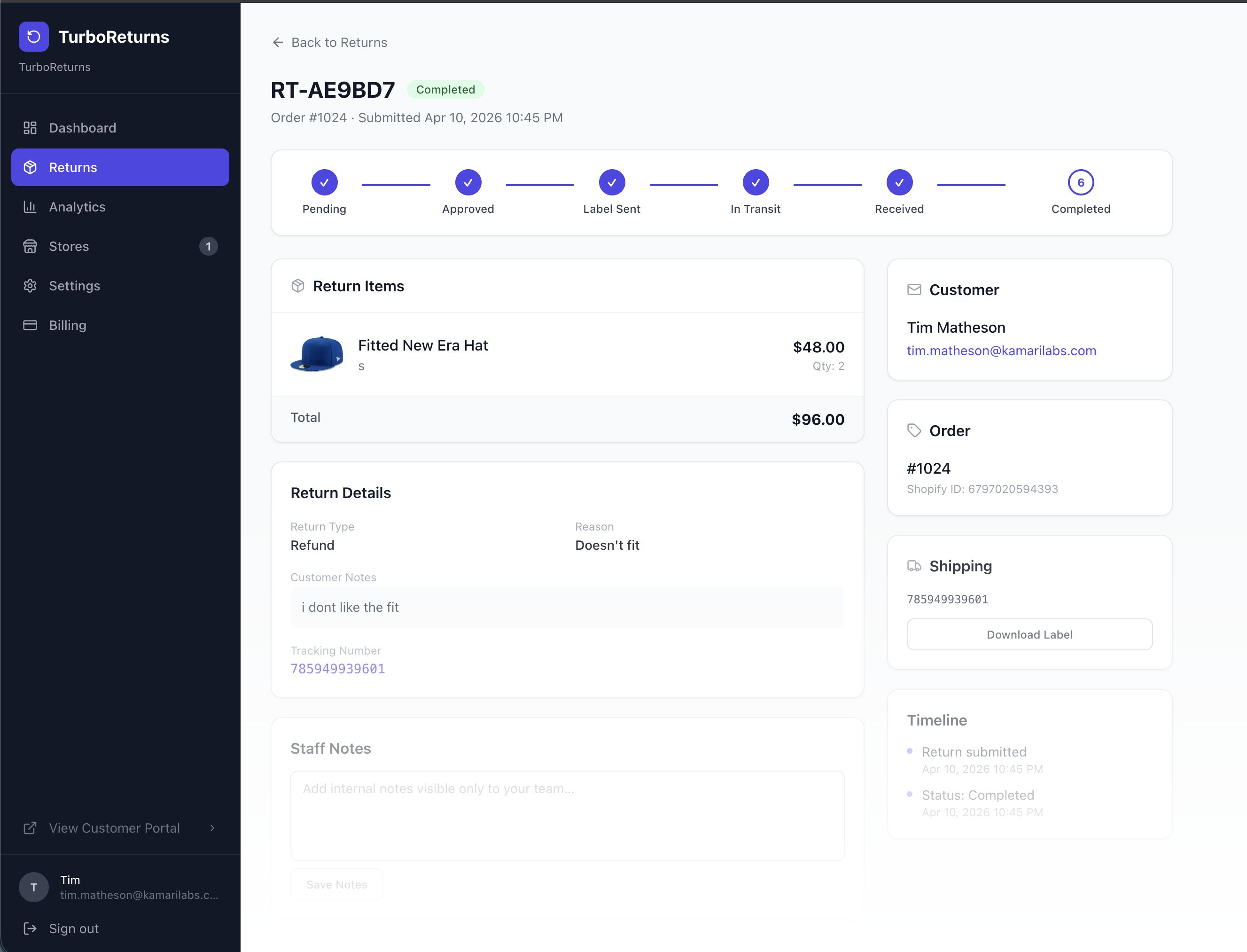 TurboReturns gives your Shopify store a branded returns portal, automated shipping labels, smart exchange nudges, and tracking that triggers refunds for you.