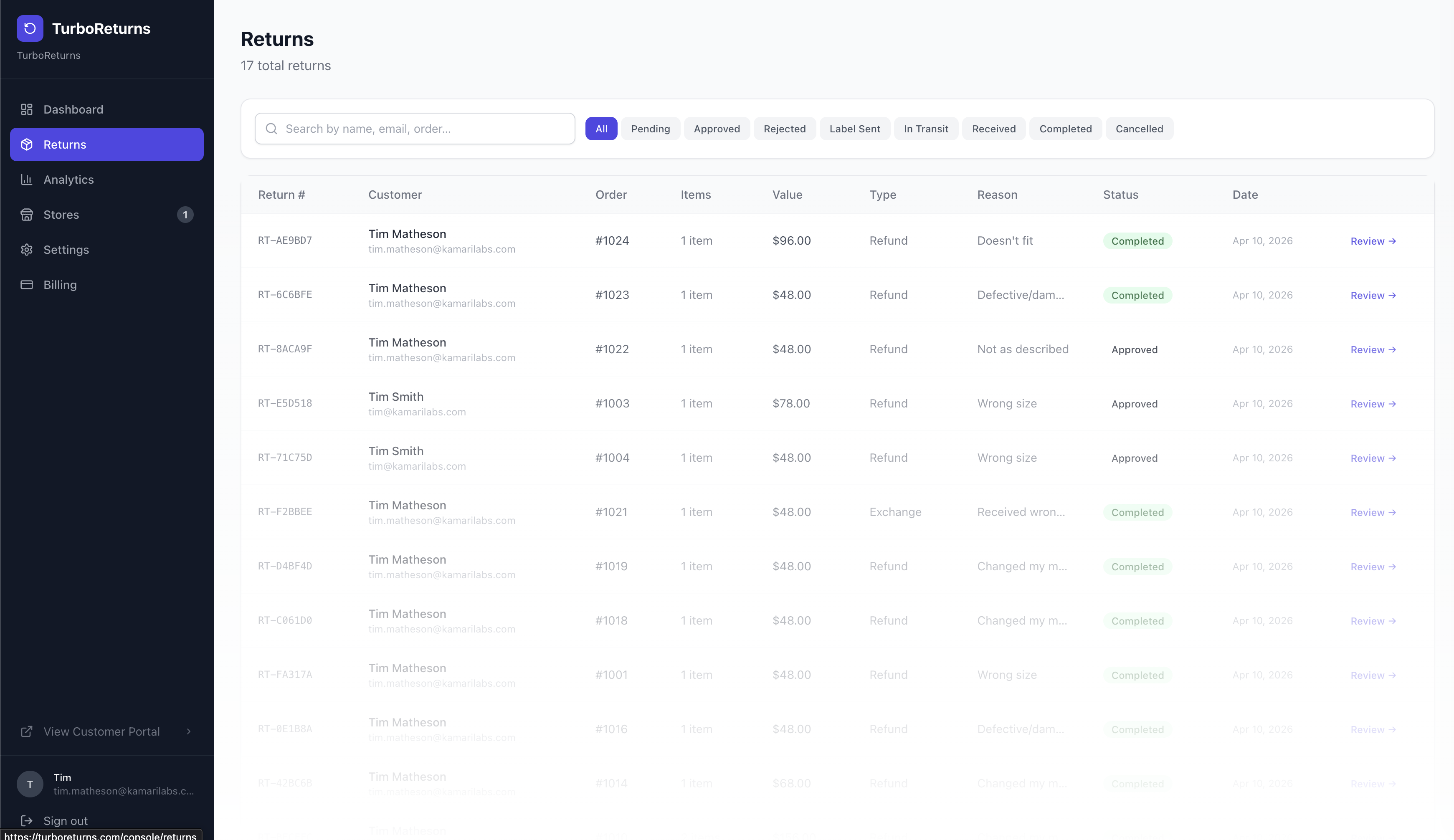 Your team sees every return in a clean dashboard. Approve, reject, or let auto-approve rules handle it for you.